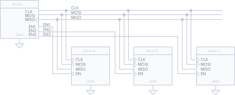 The master also has a dedicated data input line, called MISO (master in, slave out). Only the active slave is allowed to transmit on this line. All the other slaves MUST transition to high-z mode when they are not active - i.e. they may not drive the line. This is the function of a tri-state buffer. In SPI, data is typically sent most significant bit first. (MSB first)